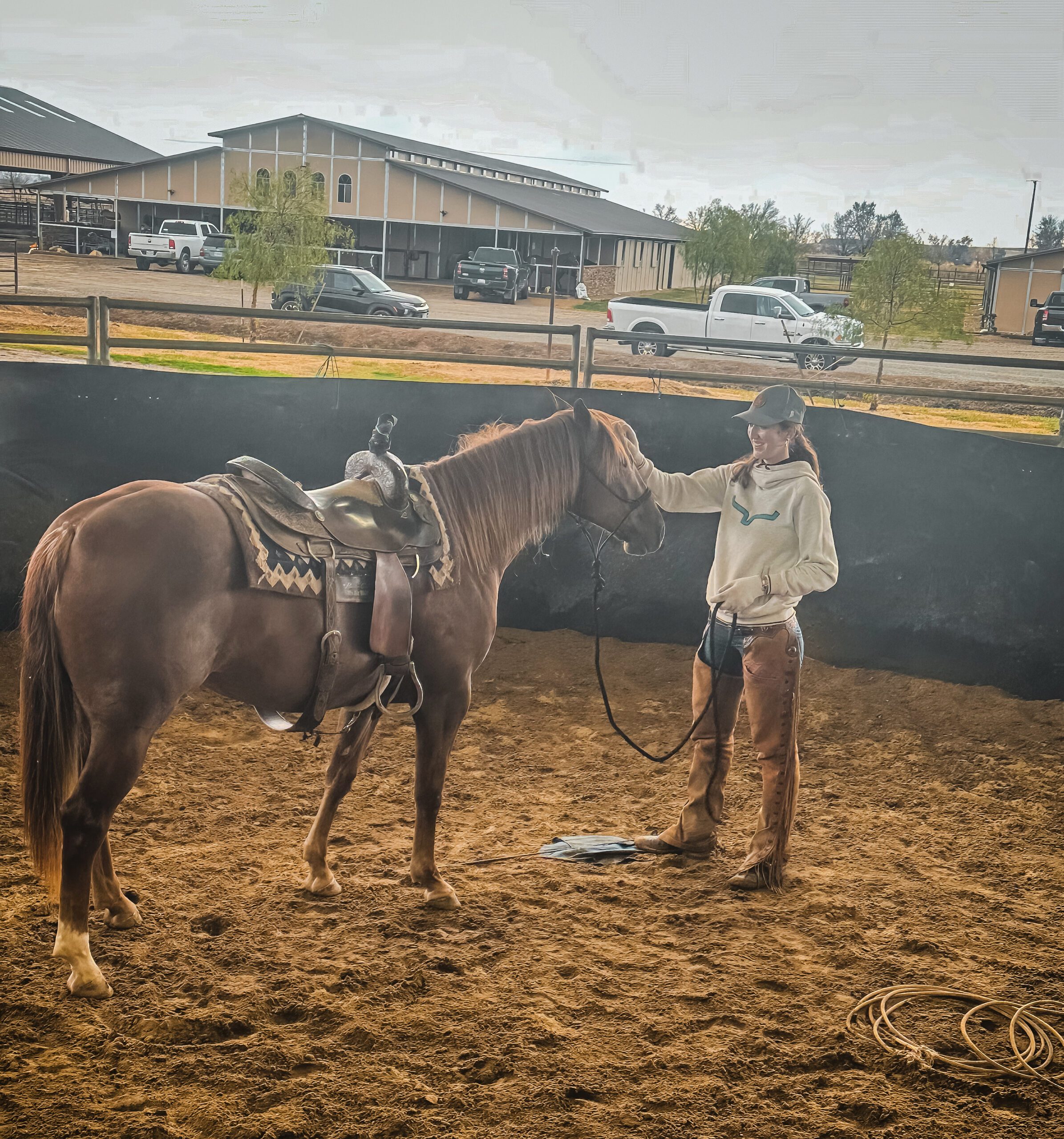 Two year olds gain plenty of exposure, gathering stock, riding trails, working the track cow, flag and live cattle weekly.